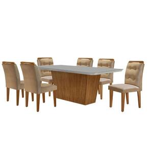 Mesa Aida 180cm Com 6 Cadeiras Carol Moderna Mobília Turim 07/off White/imbuia Mesa para Sala de Jantar Aida 180cm MDF Canto Copo com Vidro e 6 Cadeiras Carol A Sala de Jantar Aida, combinada com as elegantes Cadeiras Carol, e a escolha ideal para quem busca um espaco aconchegante e classico. O conjunto, produzido em MDF, destaca-se pela robustez e pelas linhas retas da base, que trazem um toque de charme contemporaneo. O tampo curvo em vidro nao so embeleza, mas tambem garante mais seguranca, especialmente em lares com criancas. As Cadeiras Carol, com assento e encostos estofados, apresentam detalhes com botoes no encosto, elevando o design e o conforto. Juntas, essas pecas criam um ambiente perfeito para momentos inesqueciveis a mesa