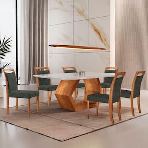 Mesa Ane 180 Tampo Com Vidro Laqueado Com 6 Cadeiras Livia Jade Off White Imbuia Natural Conjunto Mesa de Jantar Ane e Cadeira Munique: Estilo e Sofisticacao em Cada Detalhe Adicione um toque de elegancia a sua sala de jantar com o Conjunto Mesa de Jantar Ane e a Cadeira Munique. A Mesa Ane, com tampo com canto moeda e uma base geometrica, e a combinacao perfeita de design moderno e sofisticacao. Seu estilo minimalista e as linhas limpas tornam essa mesa a peca central de qualquer ambiente, seja em uma sala de jantar formal ou mais descontraida. A Cadeira Munique, com seu assento e encosto estofados, oferece conforto excepcional e estilo refinado. Os detalhes curvos em madeira no encosto sao um toque delicado, que harmonizam perfeitamente com o design da mesa.