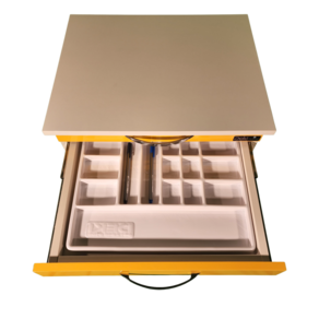 2 gavetas com Largura 39,5cm x Altura 4,5cm x Profundidade 30cm