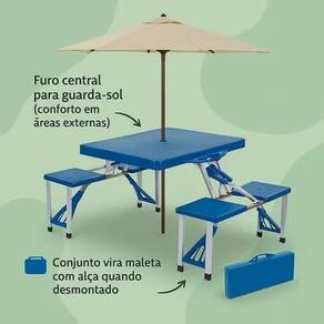 Fácil de montar e desmontar, essa mesa conta com estrutura leve, resistente e segura, com travas de segurança nas laterais da mesa e nas banquetas, garantindo maior estabilidade durante o uso.