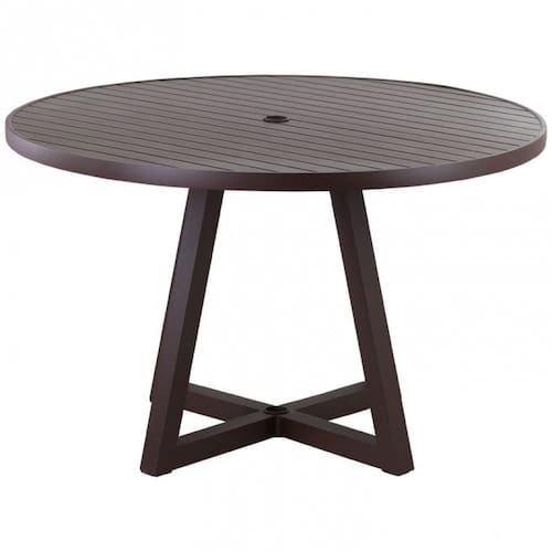 Especificações Técnicas: Mesa Bali: Altura: 80cm Diâmetro: 120cm Tampo Ripado Em Alumínio Alumínio Com Pintura Eletrostática