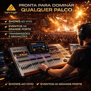 O Behringer WING é um mixer digital de 48 canais estéreo projetado para entregar performance extrema com operação intuitiva, atendendo desde grandes eventos até estúdios e produções profissionais. Ele combina um fluxo de trabalho moderno com recursos avançados de áudio, oferecendo controle absoluto sem complexidade desnecessária. O console conta com 24 faders motorizados de 100 mm, tela sensível ao toque capacitiva de 10, controles rotativos sensíveis ao toque e roda de navegação ajustável, proporcionando uma experiência de uso rápida, precisa e altamente visual. O áudio é captado com máxima fidelidade graças aos 8 pré-amplificadores MIDAS Pro, referência mundial em qualidade sonora. Um dos grandes diferenciais do WING é o conceito de Sources Fontes . Diferente dos mixers tradicionais, as entradas não são apenas canais físicos: cada Fonte carrega metadados completos como nome, cor, ícone, tags, ganho, power e modo de operação mono, estéreo ou mid-side . Isso permite uma organização extremamente eficiente mesmo com uma estrutura massiva de até 374 entradas e saídas físicas, chegando a 400 I/Os quando considerados os sinais internos. Cada um dos 48 canais 40 entradas + 8 retornos pode operar livremente em mono, estéreo ou mid-side, sem necessidade de linkar canais ou reiniciar o console. As mudanças de modo são feitas em tempo real, garantindo flexibilidade total durante a operação . Na conectividade, o WING é praticamente ilimitado: oferece AES50 SuperMAC, AES/EBU, StageCONNECT, USB 4848, MIDI, GPIO, Ethernet dupla e slot de expansão compatível com Dante, SoundGrid ou MADI via cartão opcional . Para gravação, permite capturar até 64 canais diretamente em cartões SD duplos ou via USB direto para DAWs. O processamento interno é extremamente robusto, com EQ paramétrico de até 6 bandas por canal, 8 bandas por barramento, processamento dinâmico completo, 16 processadores FX estéreo, além de slots de plugins variáveis. O WING também funciona como controlador DAW compatível com protocolos HUI e Mackie. Compacto para sua capacidade, o console mede 87 cm de largura, 57,4 cm de profundidade, 20 cm de altura e pesa 23 kg, sendo uma solução completa para quem exige potência, flexibilidade, qualidade sonora e fluxo de trabalho em um único equipamento.