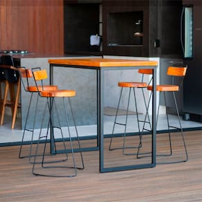 A Mesa Bistrô Alta de Estilo Industrial combina elegância e robustez para qualquer espaço. Seu tampo de madeira nobre de Peroba, com generosos 5cm de espessura, confere um charme rústico e autêntico, enquanto a estrutura em aço garante durabilidade e resistência.