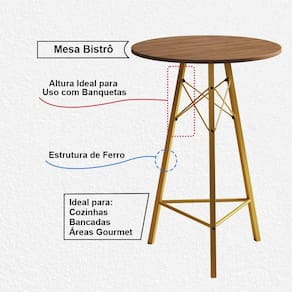 ATENÇÃO AS IMAGENS SÃO MERAMENTE ILUSTRATIVAS E PODEM SOFRER VARIAÇÕES DE COR E PEQUENOS DETALHES DE ACORDO COM O SEU MONITOR, ILUMINAÇÃO DO AMBIENTE E ATÉ MESMO A SUA PERCEPÇÃO VISUAL.Mesa Bistrà Redonda Estrutura em Ferro Dourado com Tampo FreijÃ