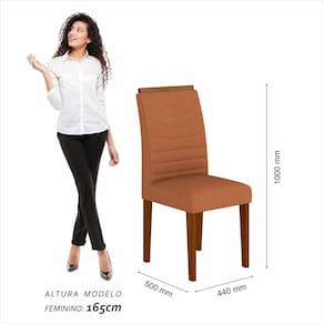 Detalhes Técnicos das Cadeiras -Assento e Encosto Tapeçados, Estofados e Fixos -Peso Suportado da Cadeira:90KG -Facilidade da Montagem:Média -Tonalidade da Cadeira:Cinamomo/Suede Terracota -Espuma do Assento:D16 -Tipo de Pintura:UV Texturizada -Material da Estrutura:MDF/Madeira Eucalipto -Medida da Cadeira:A100CMxL44CMxP50CM