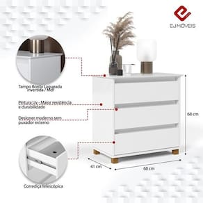 Mesa de cabeceira mini cômoda branco - comprar moveis para sua casa Mini comoda estilo retrô, pés palito, embalado com caixa reforçada nas laterais para não ocorrer no transporte. Vendido pela comprar moveis em casa para deixar seu ambiente mais bonito e sofisticado procure nossas redes sociais e confira todos nossos produtos e qualidade de atendimento : Dimensões do produto montado Altura: 0,68 cm largura: 0,68 cm profundidade: 0,41 cm Caractersticas: 3 gavetas corrediça telescópica tampo de borda invertida em mdf Produto em mdp Montagem: Este produto acompanha kit de montagem + manual de instrução detalhando passo a passo de como montar. A montagem do produto deverá ser feita por um , para que não ocorram danos no produto. não nos responsabilizamos por erro de montagem Atenção: a montagem não é oferecida pela comprar moveis em casa, a montagem do produto é por conta do comprador. Observações importantes: A é de 90 dias por defeitos de fabricação. Se no ato de recebimento do produto o cliente verificar que o produto não está em prefeito estado, principalmente por ocasião de transporte irregular, o cliente deverá recusar o recebimento do produto e entrar em contato para resolver o problema. Podem haver variações referentes à tonalidade das cores expressas nas fotos, por conta de fatores como iluminação e brilho de cada monitor/celular. Fotos meramente ilustrativas, não acompanham os produtos de decoração. Se atente a politica de troca e devolução da empresa. Marca: Não Informado Ean: 7795296297403