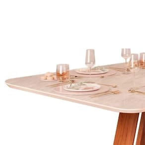 Para maior durabilidade da mesa, ela possui sapatas deslizadoras que a protegem da umidade, deixando-a levemente afastada do chao. A Mesa Celeste e o Tampo de Madeira Chanfrado Pintado vao deixar o seu ambiente muito mais sofisticado, acomodando ate 6 pessoas, vai receber a sua familia e amigos em um