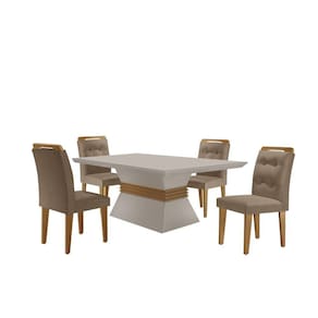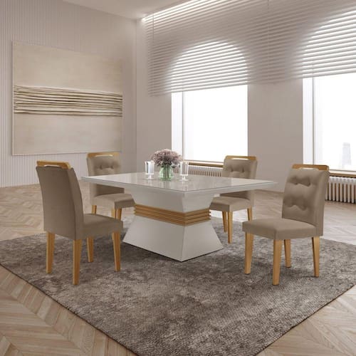 Sala de Jantar Ágata, produzida em material 100% MDF e tampo em MDF chanfrado. Em sua confecção é utilizada a pintura UV com acabamento em semi brilho, que preservam a cor por mais tempo. As cadeiras são revestidas com tecidos de alta qualidade, e estofadas com espuma D-16 no assento e espumas D-14 encosto. Medida da Mesa (A x L x P): 80 cm X 120 cm X 80 cm Peso da Mesa: 45,75 kg Mesa suporta até: 20 kg Acabamento da Cadeira/Banco: Pintura UV Acabamento da Mesa: Pintura UV Acompanha Manual de Instalação: Sim Almofada do assento: Fixa Ambiente Principal: Sala de Jantar Cadeira/Banco estofada: Encosto e Assento Estofados Cadeira/Banco suporta até: 100 kg Complexidade da Montagem: Média: pode ser montado por mais de uma pessoa e/ou necessite de maior conhecimento para montagem Cor: Capuccino/Off White/Imbuia/Serig. Off Cor da Base: Off White Cor do Produto: Capuccino/Off White/Imbuia/Serig. Off Cor do Tampo: Off White Cor Flex: Não Cor Secundária: Marrom De Canto (Canto Alemão): Não Design da Base: Pedestal Enchimento do Assento: Espuma D-16 Enchimento do Encosto: Espuma D-14 Escala de Brilho: Semi-Brilho Espessura do Tampo: 15 mm Estrutura do Assento: MDF - 9 MM Estrutura do Encosto: MDF - 2,5 mm Formato do Tampo: Retangular Itens Inclusos: 1 Mesa, 4 cadeiras e 1 manual de montagem Manual de Montagem e Instalação: https://product-hub-prd.madeiramadeira.com.br/906109/documents/7314a427-7f3c-4842-b67a-8bbc95848f681930760mesaclarice120.pdf Material da Base da Mesa: MDF Material da Estrutura da Cadeira: MDF Material do Tampo: MDF Material Principal: MDF/Tecido Material Principal das Cadeiras/Bancos: MDF Medida da Cadeira/Banco (A x L x P): 102,5 cm x 42 cm x 56 cm Medida do Tampo (L x C x E): 80 cm X 120 cm X 15 cm Mesa Dobrável: Não Mesa Extensível: Não Montagem Flex: Não Necessita Montagem: Sim Origem do Produto: Nacional Peso da Cadeira/Banco: 8,075 kg Possui Apoio para Braços: Não Possui Apoio Para os Pés: Não Possui Prateleiras: Não Possui Rodízio: Não Possui Suporte Giratório: Não Possui Vidro: Sim Quantidade de Cadeiras: 4 Quantidade de Lugares: 04 Recomendações de Uso, Manutenção e Limpeza: Limpar com pano seco Revestimento da Cadeira/Banco: Veludo Sistema de Montagem: Parafusos Tipo de Assento: Fixo Tipo de Encosto: Fixo