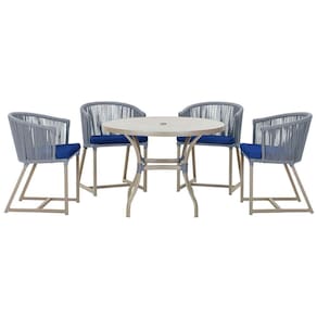 Descubra a Elegancia e Durabilidade da Mesa de Jantar Roma e Cadeiras Noronha. Combinando estilo e resistencia, esta Mesa e cadeiras traz o melhor do design contemporaneo em aluminio com micro pintura e acabamento em corda nautica. O estofado impermeavel completa o conforto e a funcionalidade, tornando-a ideal para ambientes externos e internos.