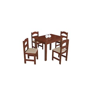 Características: Matéria-Prima da mesa: Madeira de Pinus Maciço Tampo da mesa: Em MDF Pintura/Acabamento da mesa: Superfície Impressão UV Borda da mesa: Esmalte PU Matéria-Prima da cadeira: Madeira de Pinus Maciço