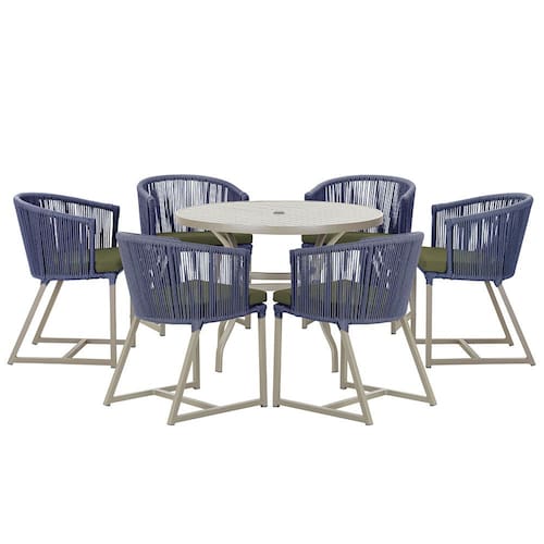 Combinando estilo e resistência, esta Mesa e cadeiras traz o melhor do design contemporâneo em alumínio com micro pintura e acabamento em corda náutica. O Estofado impermeável completa o conforto e a funcionalidade, tornando-a ideal para ambientes externos e internos.