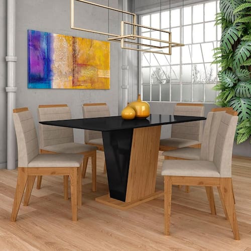 A Mesa com 6 Cadeiras Qatar 160cm é moderno e encantador, capaz de iluminar a sua sala de jantar!