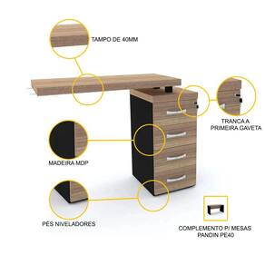 Para seu negócio crescer, seu escritório precisa acompanhar a mudança. Se você precisa de mais espaço para trabalhar, essa mesa complementar com tampo e quatro gavetas em madeira na cor natural é uma das muitas opções de peças práticas e modulares da Pandin para compor um escritório sob medida. Este complemento amplia sua área de trabalho em mais de 1 metro além da mesa principal, oferecendo mais espaço para a organização de seus documentos e materiais de trabalho, além de oferecer quatro gavetas com fechadura. Esta é mais uma peça profissional com a qualidade da linha PE40 da marca Pandin, conhecida por seus móveis de escritório de design clássico e sofisticado que unem beleza, funcionalidade e estilo ao melhor custo-benefício do mercado. Para que seu projeto fique completo, consulte nossa loja e encontre outras opções de móveis da mesma linha, como mesas simples com ou sem gaveta, arquivos, estantes, gaveteiros e armários.