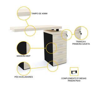 Para seu negócio crescer, seu escritório precisa acompanhar a mudança. Se você precisa de mais espaço para trabalhar, essa mesa complementar com tampo e quatro gavetas em madeira na cor clara é uma das muitas opções de peças práticas e modulares da Pandin para compor um escritório sob medida. Este complemento amplia sua área de trabalho em mais de 1 metro além da mesa principal, oferecendo mais espaço para a organização de seus documentos e materiais de trabalho, além de oferecer quatro gavetas com fechadura. Esta é mais uma peça profissional com a qualidade da linha PE40 da marca Pandin, conhecida por seus móveis de escritório de design clássico e sofisticado que unem beleza, funcionalidade e estilo ao melhor custo-benefício do mercado. Para que seu projeto fique completo, consulte nossa loja e encontre outras opções de móveis da mesma linha, como mesas simples com ou sem gaveta, arquivos, estantes, gaveteiros e armários.