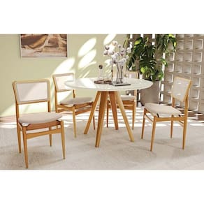 Sala Jantar Mesa Duna Premium Madeira Maciça c/ Tampo Madeirado c/ Vidro 120x120cm e 4 Cadeiras Stela Carvalho/Off White - Linho Bege Argila - Kappesberg