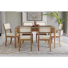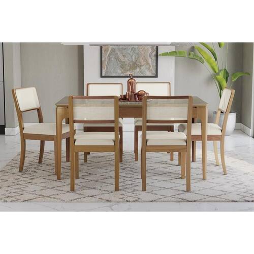 Sala Jantar Mesa Mira Premium Madeira Maciça c/ Tampo Madeirado c/ Vidro 160x90cm e 6 Cadeiras Lola Carvalho/Freijo Bronze - Linho Bege Argila - Kappesberg