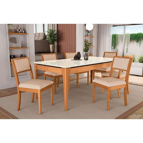 Sala Jantar Mesa Mira Premium Madeira Maciça c/ Tampo Madeirado c/ Vidro 200x100cm e 6 Cadeiras Alice Carvalho/Off White - Linho Bege Argila - Kappesberg