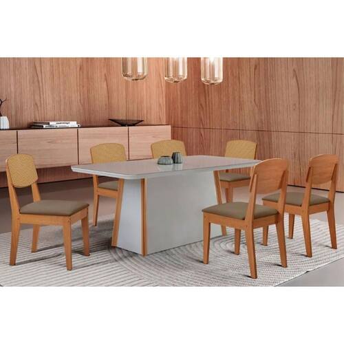 Sala de Jantar Completa Tilia c/ Tampo Madeirado c/ Vidro Canto Curvo 180x90cm e 6 Cadeiras Havana Premium Naturale/Off White - Suede Capuccino - Rufato Abaixo segue os produtos do KIT: Sala de Jantar Completa Tilia c/ Tampo Madeirado c/ Vidro Canto Curvo 180x90cm e 6 Cadeiras Havana Premium Naturale/Off White - Suede Capuccino - Rufato