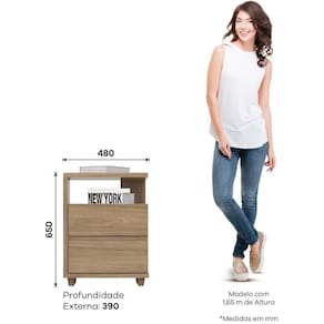 Com duas gavetas espaçosas, ela oferece amplo espaço para organizar seus objetos pessoais, e os detalhes chanfrados, que substituem os puxadores, dão um toque moderno e clean ao design.