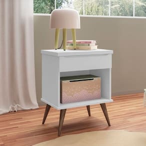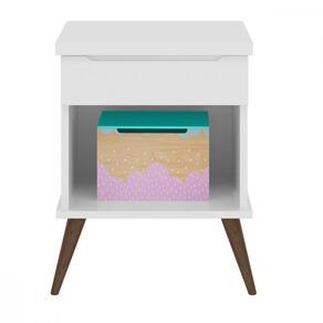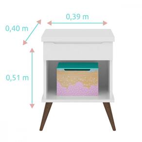 Características: Estrutura em MDF Acabamento em Pintura UV atóxica 1 Gaveta Corrediças telescópicas Puxador em Cava 4 Pés Pés em Eucalipto Gaveta suporta até 5kg