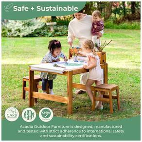 Mesa de arte infantil para área externa em madeira acácia, desenvolvida para atividades de desenho, pintura, brincadeiras sensoriais e piqueniques em quintais, pátios e jardins. A estrutura retangular oferece superfície ampla e estável para uso com diferentes materiais, com acabamento pensado para resistir à exposição ao sol, umidade e respingos de tinta dentro das rotinas de uso recomendadas para móveis externos.?