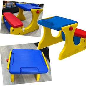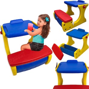 A Mesa Recreio com Baú da Bandeirante está disponível em modelo único, com tampo azul, base amarela e banco vermelhos.