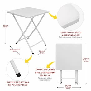 Mesa de Bar Dobrável de Aço Ferro Metal Quadrada º Quer mais praticidade e elegância para seu bar, restaurante e churrascos de finais de semanaA Mesa de Aço é ideal para ajudar nessa tarefa do dia a diaA Mesa Açomix conta com tampo estampado sem soldas 58x58 cm, única mesa de aço quadrada com cantos arredondados, trazendo mais harmonia e segurança. Possui tratamento antiferrugem e pintura a pó epóxi. Além de tudo é dobrável e você pode otimizar seu espaço guardando em qualquer cantinho.Medidas da Mesa de Bar º Comprimento: 58mº Largura: 58cmCaracterísticas da Mesa de Restaurante º Conjunto dobrável º Tratamento antiferrugemº Pintura a pó epóxiº Cantos arredondadosº Tampo estampado sem soldasº Tampo em Aço Tampo 58x58 cm Informações Técnicas da Mesa de Lanchoneteº Código: 10402º Dimensões:- Aberta AxLxP 71x58x58 cm- Fechada AxLxP 91,5x58x8 cm- Tampo: 58x58 cmº Peso: 3,8 kg
