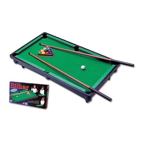 Mini Mesa De BilharUm jogo de competição onde os jogadores irão executar as habilidades através da prática de pontaria e da precisão de movimentos.Fácil de carregar, você pode levar o mini bilhar a qualquer lugar para jogar e fazer as competições mais emocionantes com seus amigos!Preço por UnidadeCaracterísticas- Material do pano: Veludo- Material da mesa: Plástico- Tacos com pontas emborrachadas- Bolas e tacos feitos de plásticoDetalhes do produto- Possui pezinho para encaixe- Recomendado para crianças a partir de 4 anos- Contém : 2 tacos, 1 triangulo, 10 bolas coloridas + 1 bola branca- Possui selo do inmetro: E-BRI/IQB-5868 NM 300/2002 OCP 0006- Na caixa do brinquedo vem explicado quantos pontos cada cor vale.Observação- Este brinquedo só deve ser entregue à criança após ter sido montado por um adulto- Todas as crianças devem ter acompanhamento de adultos enquanto estiverem brincando