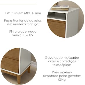 Transforme seu quarto com a Mesa de Cabeceira, uma peça que une beleza e funcionalidade. Com estrutura em MDF de 15mm, seus pés e frentes de gaveta são confeccionados em madeira maciça, garantindo resistência e durabilidade. O acabamento conta com pintura acetinada em verniz PU e UV, proporcionando um toque suave e proteção extra. O design funcional possui 02 gavetas com puxador cava e corrediças telescópicas, que propocionam abertura suave e silenciosa, além de 01 nicho para acomodar objetos decorativos ou de uso diário. Este móvel chegará em sua casa separado em 01 volume.