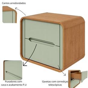 Confeccionada em MDF, que garantem durabilidade e resistência. Possui cantos arredondados, equipado com puxadores embutidos, duas gavetas espaçosas que deslizam suavemente graças às corrediças telescópicas, facilitando o acesso e a organização de seus pertences. É uma excelente escolha para quem busca um toque contemporâneo e funcionalidade no quarto.