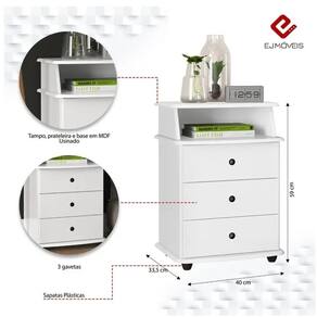 - 03 Gavetas;- Produto de alta qualidade e durabilidade;- Pés em Plástico anti-umidade- Nicho;- Pintura em acabamento fosco;- Produzido em MDF e MDP; Atenção! Confira as dimensões deste produto e certifique-se de que passará normalmente por supostos elevadores, portas, escadas e/ou corredores de sua moradia; As imagens são ilustrativas, eletrodomésticos e demais objetos que compõem o cenário, não fazem parte do anúncio; Sobre a tonalidade das cores, poderá ocorrer alterações conforme a configuração do seu monitor. Orientamos que a montagem e instalações do produto seja realizado por um técnico de sua confiança, após a sua entrega. Garantia de 3 meses pelo fornecedor Marca: Não Informado