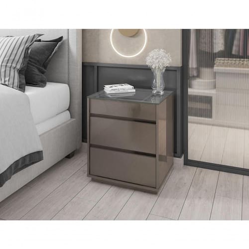 O Criado Belize é ideal para o seu quarto! Ele possui 3 gavetas sendo que a superior possui um organizador interno para joias, relógios, etc, feito em MDF. As gavetas possuem corrediças telescópicas. Tampo feito de vidro, base e laterais feitos em MDP de 25mm, e possui 3 travessas transversais em MDP de 15mm que garante maior estabilidade e resistência à estrutura.
