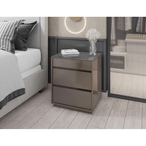O Criado Serena é ideal para o seu quarto! Ele possui 3 gavetas sendo que a superior possui um organizador interno para joias, relógios, etc, feito em MDF. As gavetas possuem corrediças telescópicas. Tampo feito de vidro, base e laterais feitos em MDP de 25mm, e possui 3 travessas transversais em MDP de 15mm que garante maior estabilidade e resistência à estrutura.