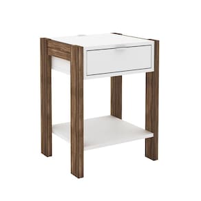 Mesa de Cabeçeira para Quarto Decorativa AZ1016 MDP Branco/Nogal - Gran Belo Possui tomada na sua base, possui uma gaveta, estrutura em MDP, acabamento de excelente qualidade. Com designer contemporâneo, e linhas simétricas, a união de suas sobre cores m ao ambiente sensações de harmonia e elegância entre a decoração. Prática e cheio de estilo se destaca em qualquer tipo de ambiente.