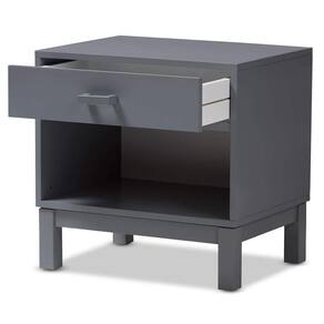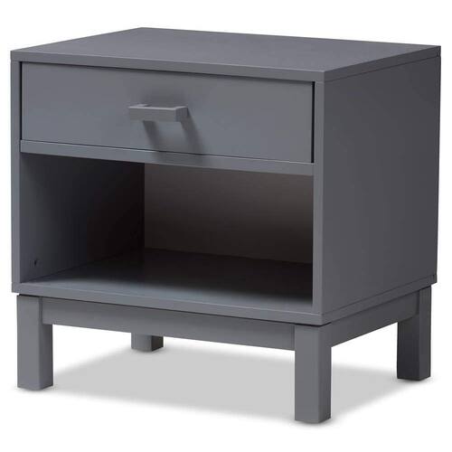 - Atualize sua cabeceira com o visual limpo e charmoso da mesa de cabeceira Deirdre. O design moderno e contemporâneo desta mesa de cabeceira facilita a coordenação com a cor do seu quarto, quarto de hóspedes ou berçário. A estrutura de madeira de seringueira resistente e projetada da Deirdre tem acabamento cinza e feita para durar. A mesa de cabeceira possui uma gaveta superior com uma alça de madeira e uma prateleira aberta diretamente embaixo, dando a você opções extras de armazenamento