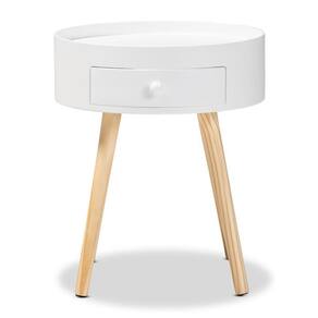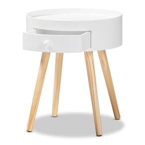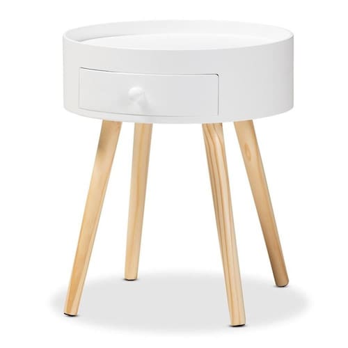 Dê ao seu quarto um senso de estilo pessoal ao adicionar esta mesa de cabeceira redonda moderna de madeira de uma gaveta de meados do século da coleção Jessen da Baxton Studio. É feito com um acabamento branco deslumbrante sobre uma construção em MDF e madeira de pinho e três pernas angulares. O único compartimento de armazenamento é espaçoso o suficiente para lençóis extras e outros acessórios.