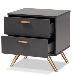 Uma expressão de bom gosto do minimalismo moderno, a mesa de cabeceira Kelson é uma solução impressionante para armazenamento de quartos. Feita na Malásia, a estrutura de madeira resistente do Kelson apresenta um acabamento cinza escuro que exala um caráter moderno e contemporâneo. Duas gavetas espaçosas maximizam o espaço do quarto com armazenamento conveniente para todos os itens essenciais de cabeceira. Exigindo montagem, o Kelson utiliza pernas em ângulo dourado para suporte estável com um toque luxuoso. As alças douradas dão um toque atraente, tornando a mesa de cabeceira Kelson uma adição refrescante a qualquer espaço.