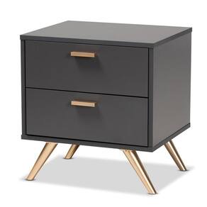 Características: - Mesa de cabeceira moderna e contemporânea - Construída em madeira e polímero projetados - Acabamento em cinza escuro e dourado - Duas (2) gavetas - Pernas angulares - Montagem necessária - Fabricado na Malásia Especificações: - Dimensões do produto: Dimensões: 20,1" de altura x 18,9" de largura x 15,75" de profundidade; Dimensões da gaveta: 3,1" de altura x 15,5” de largura x 10,4" de profundidade; Pernas: 6" de altura;