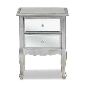 - Mesa de cabeceira francesa de transição moderna- - Maçanetas de cristal- - Acabamento prateado e espelhado- - Duas (2) gavetas-