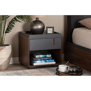 Cores e acabamento do aglomerado: cinza/nogueira Acabamento: cinza ACABAMENTO das pernas: nogueira - Mantenha sua cabeceira organizada com a mesa de cabeceira Rikke. Construído a partir de aglomerado sólido, o Rikke apresenta um acabamento em dois tons de cinza e marrom nogueira para uma sensação fresca e contemporânea. Uma gaveta espaçosa e uma prateleira oferecem espaço para guardar itens essenciais de cabeceira.