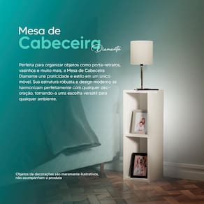 Ideal para ambientes pequenos e espaços compactos, a mesa de cabeceira Diamante ocupa pouco espaço, possui compartimentos para decoração ou objetos pessoais, deixando tudo o que você precisa o seu alcance.