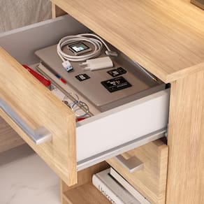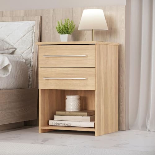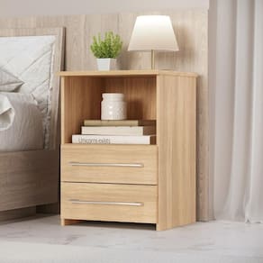 MESA DE CABECEIRA BRUNA | Com 2 gavetas em corrediças metálicas e espaço para livros a mesa de cabeceira Bruna vai deixar o seu quarto mais organizado. Possui um design moderno e puxadores cromados. Além disso, o produto possui uma fácil montagem. A mesa possui montagem flex com as gavetas podendo ser montadas tanto para cima como para baixo.