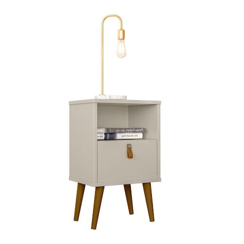 Beleza nos detalhes! A mesa de cabeceira é compacta e funcional, encaixando perfeitamente em espaços pequenos do seu quarto, ideal para dispor luminárias e objetos de utilidade diária.