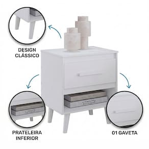 O modelo conta com 01 gaveta com corrediça telescópica, que permite abertura total, facilitando o acesso aos seus itens pessoais com mais praticidade. Além disso, possui 01 prateleira inferior, ideal para acomodar livros, objetos decorativos ou itens essenciais ao lado da cama.