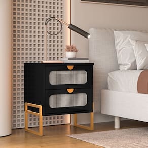 Tipo: Mesa de Cabeceira Modelo: Titanium Cor: Preto Cor da Base: Dourado Estrutura: MDP com acabamento em pintura UV Pés: Metal com pintura eletrostática Possui 2 gavetas: Corrediças metálicas Frentes decorativas em padrão rattan Puxadores embutidos Design: Moderno, funcional e elegante Garantia: 3 meses contra defeitos de fabricação