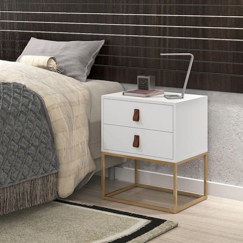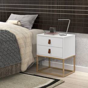 Mesa de Cabeceira Estilo Industrial Unic Puxador Couro Estilo Europeu Base Dourada - Branco