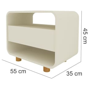 Estrutura: 100% MDF Acabamento: Pintura U.V.Gaveta: Sim, 01 gaveta de design flutuante com corrediças telescópicas e boradas chanfradas e laqueadasNicho: Sim, 02 nichos Pés: Sim, pés em madeira maciça Diferencial: Design CurvoDimensões do produto montado
