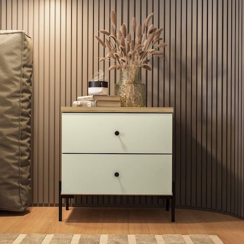 A Mesa de Cabeceira Ilium possui design contemporâneo e é o móvel ideal para decorar o seu quarto, sem deixar de lado a funcionalidade. Este móvel é fabricado em chapa revestida em BP, um acabamento que confere a beleza no amadeirado natural e toque aveludado com mais durabilidade e resistência. Conta com duas gavetas com corrediças telescópicas para organizar seus objetos pessoais e o tampo também serve de apoio para seus acessórios. O seu puxador em metal com acabamento Soft touch combina com os pés em metal, tornando este móvel moderno a peça que falta para compor seu quarto.