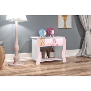 Mesa de Cabeceira Lara Princesa Branco/Rosa. Produzido em MDF/MDP a Mesa de Cabeceira Lara possui corrediça metálica que auxilia na abertura de sua gaveta e na qualidade do produto, Além de Imagens alegres e atuais seu excelente acabamento com pintura U. V. e Verniz Brilhante de alta resistência trás durabilidade ao móvel. Ean: 7909903336991
