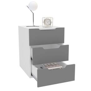 O(a) Mesa de Cabeceira Madri 3 Gavetas Cinza/Branco - Politorno é produzido em MDP na escala de brilho Semi-Fosco, e possui um grau de dificuldade de montagem: Médio.